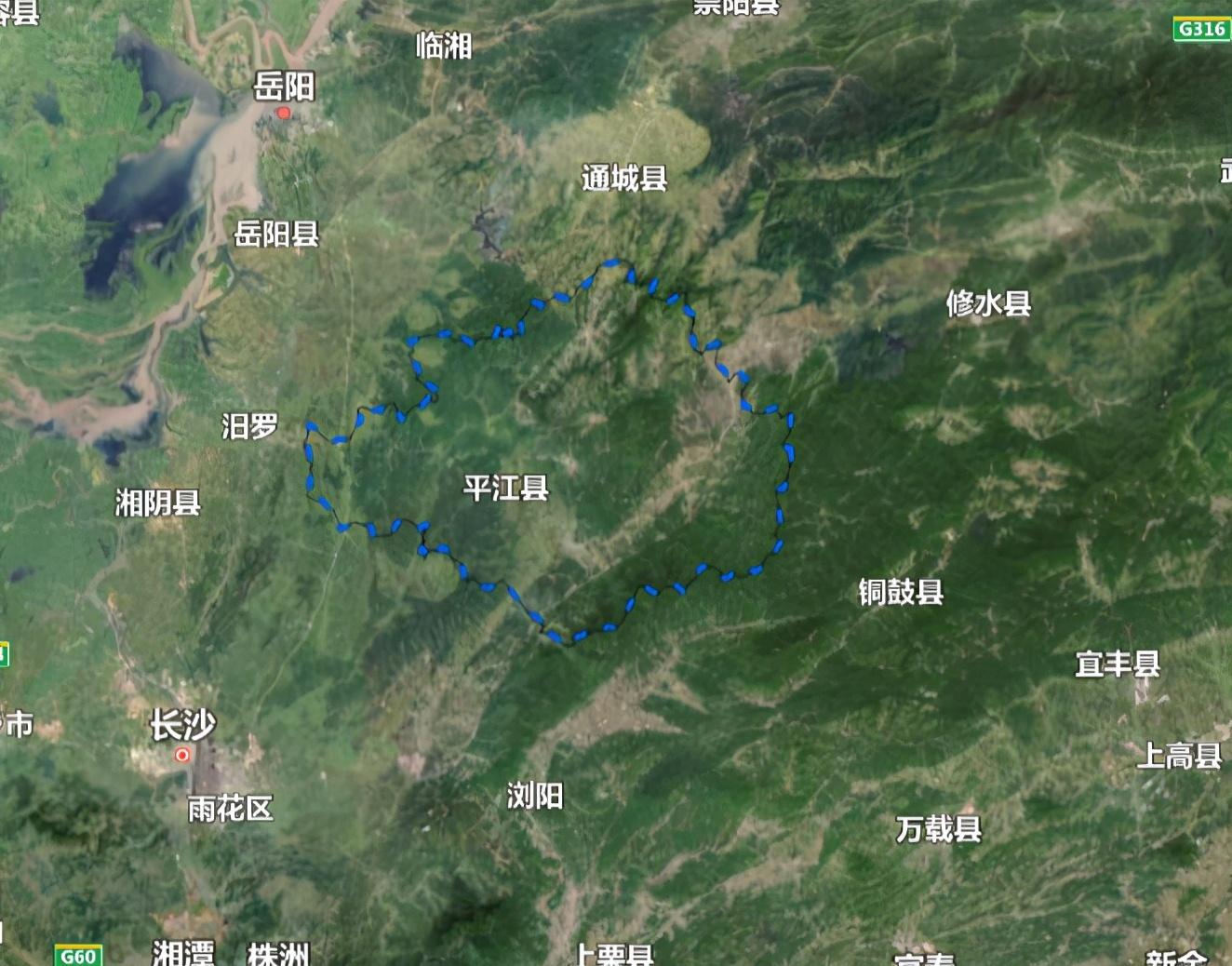 东与江西省修水县、铜鼓县交界,西与汨罗市毗邻,南与浏阳市、长沙县接壤,北与湖北省通城县、岳阳县相连,东西长98.5千米,南北宽76.1千米,总面积4125平方千米。