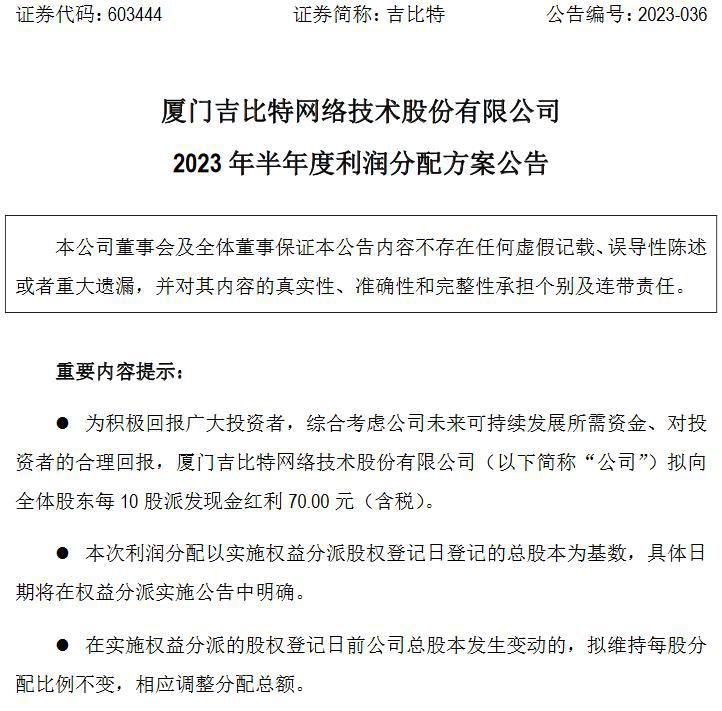 吉比特公告,综合考虑公司未来可持续发展所需资金、对投资者的合理回报,拟向全体股东每 10 股派发现金红利 70.00 元 ( 含税 ) ,合计拟派发现金红利约 5.04 亿元 ( 含税 ) 。这也就意味着,此次半年度分红占公司当期净利润的约 75%。