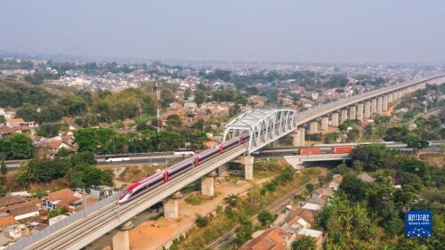 这是9月30日在印度尼西亚普哇加达拍摄的一列行驶中的雅万高铁高速动车组(无人机照片)。