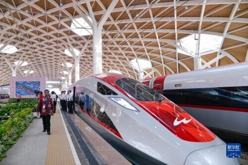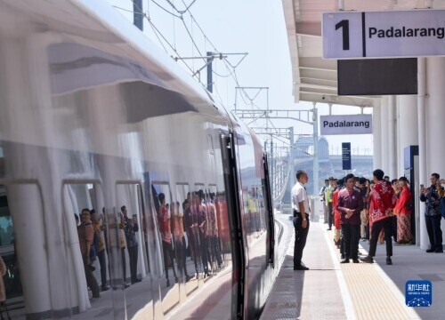 10月2日,在印度尼西亚雅加达哈利姆高铁站,雅万高铁高速动车组停靠在站台上。