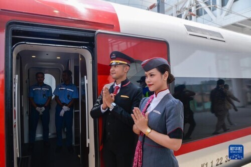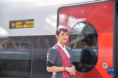 10月2日,在印度尼西亚雅加达哈利姆高铁站,乘务人员欢迎乘客和嘉宾。