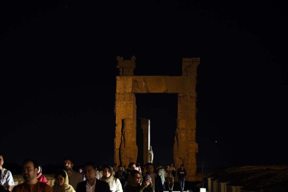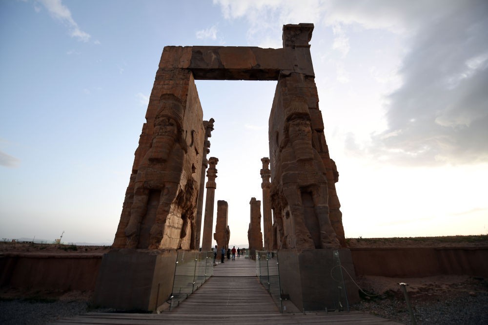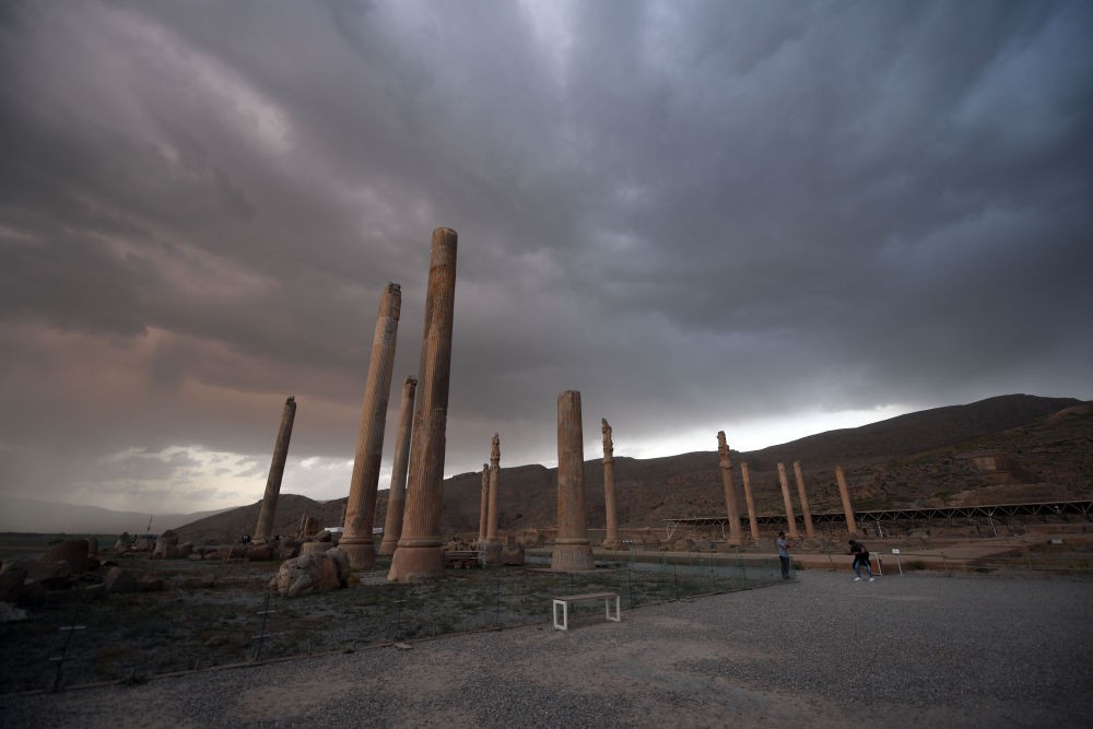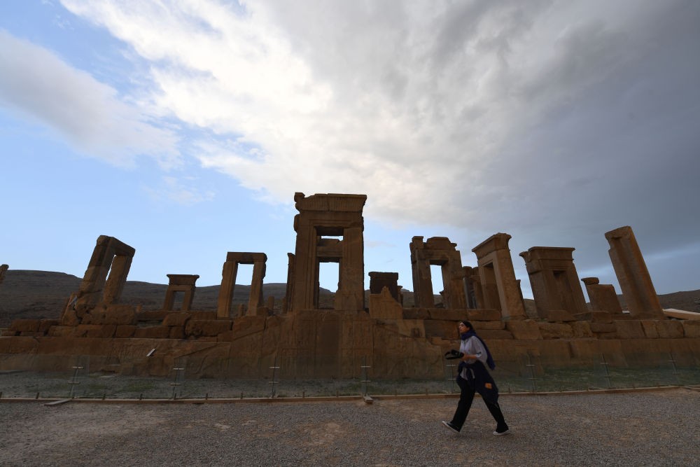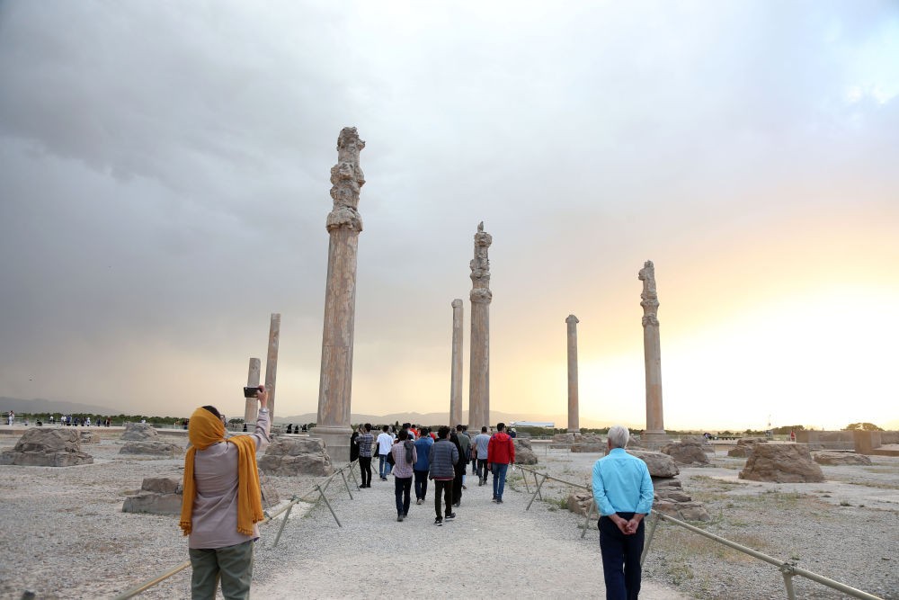5月7日,游客在伊朗南部城市设拉子附近波斯波利斯遗址游览。