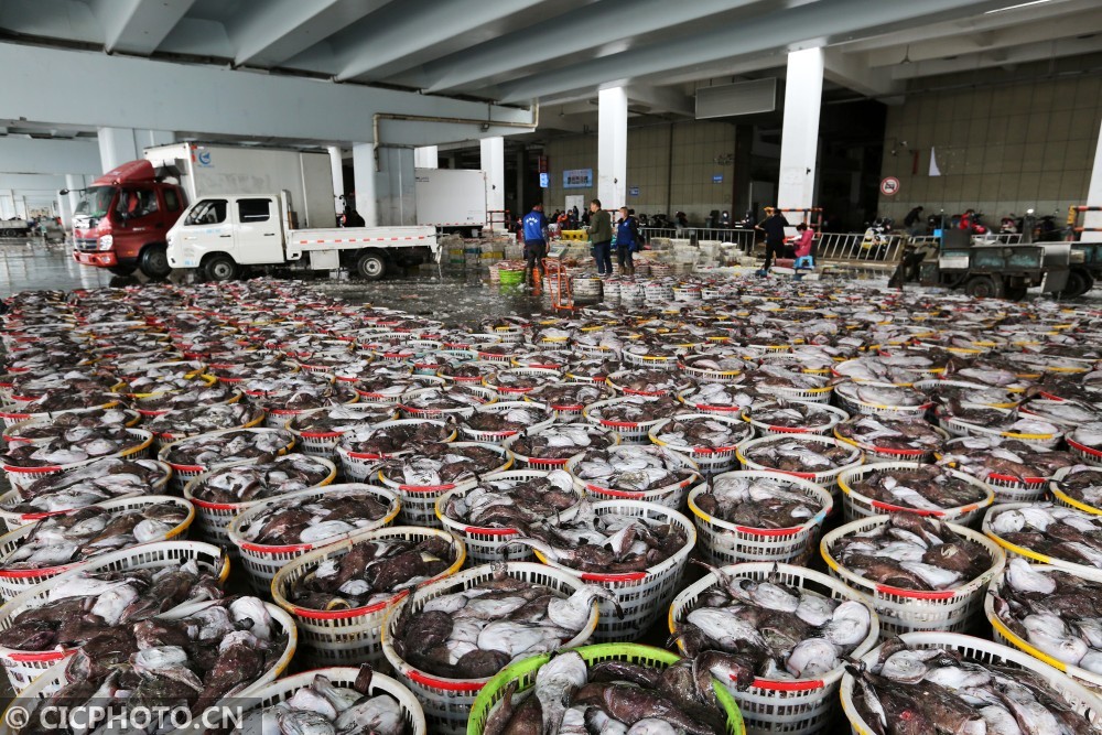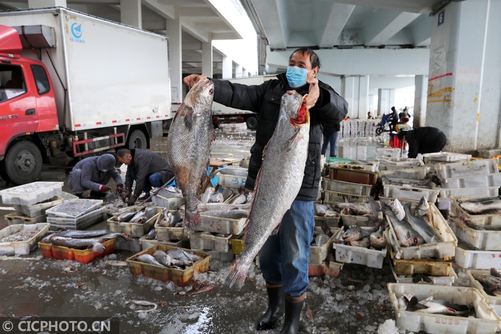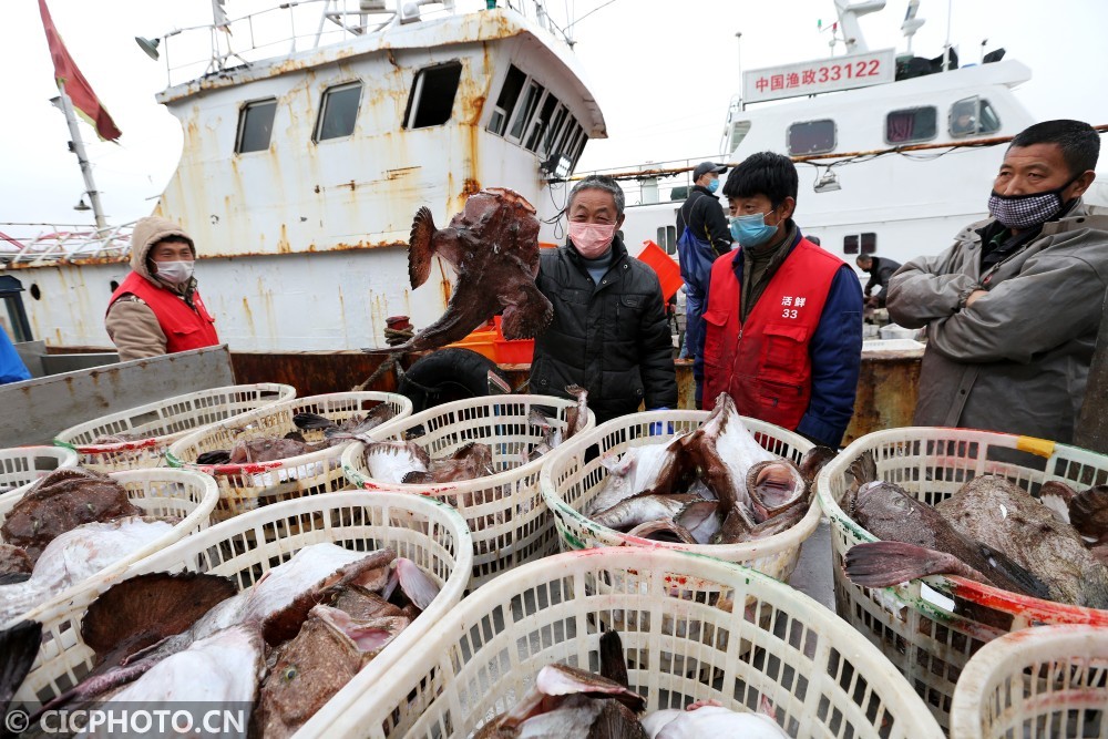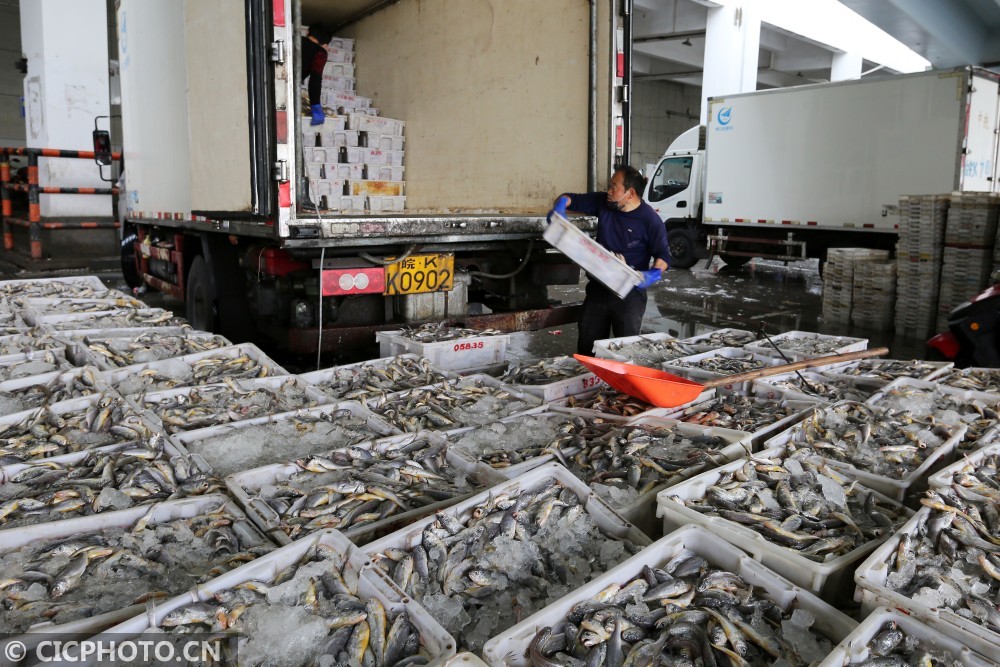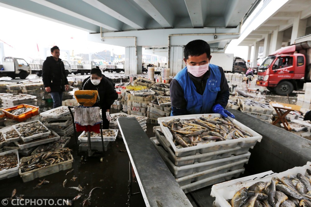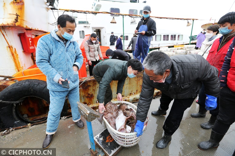 ↑2020年3月1日,浙江舟山沈家门中国舟山国际水产城码头上,渔民将新捕捞的鱼产搬上车。CICPHOTO/姚峰 摄