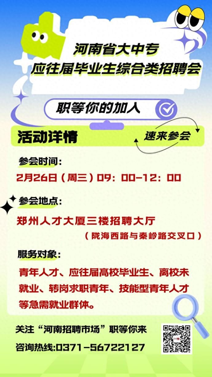 2月24日,记者从郑州市人才交流中心获悉,2月26日(周三)上午,由郑州市人才交流中心、郑州市金水区人力资源和社会保障局联合主办的河南省大中专应往届毕业生综合类招聘会,将在郑州市人才交流中心3楼招聘大厅举办,预计提供岗位6700余个。