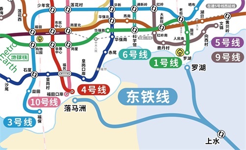 图示我们看到,香港地铁与深圳地铁只相隔一条深圳河。目前港铁和深圳地铁在福田口岸(对应香港东铁线的【落马洲站】)和罗湖口岸(对应香港东铁线的【罗湖站】)两处已经实现了通关。