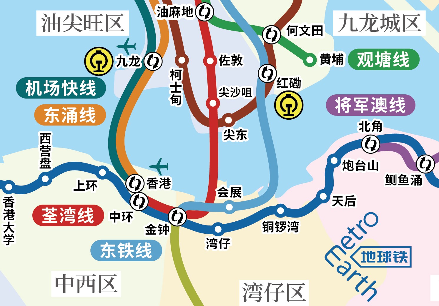 上图显示的区域是香港地铁线路和站点最为密集的中心区域。香港众多时代传奇也从这一区域腾起,这宛若一幅藏宝图——维多利亚港、金紫荆广场、太平山顶、香港故宫博物院、香港海洋公园等都错落其中,待你发现。