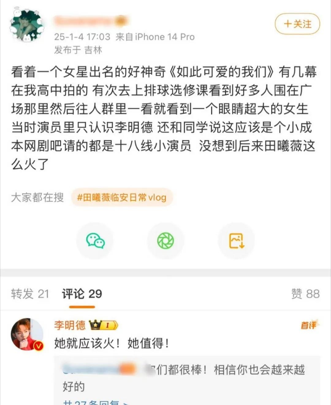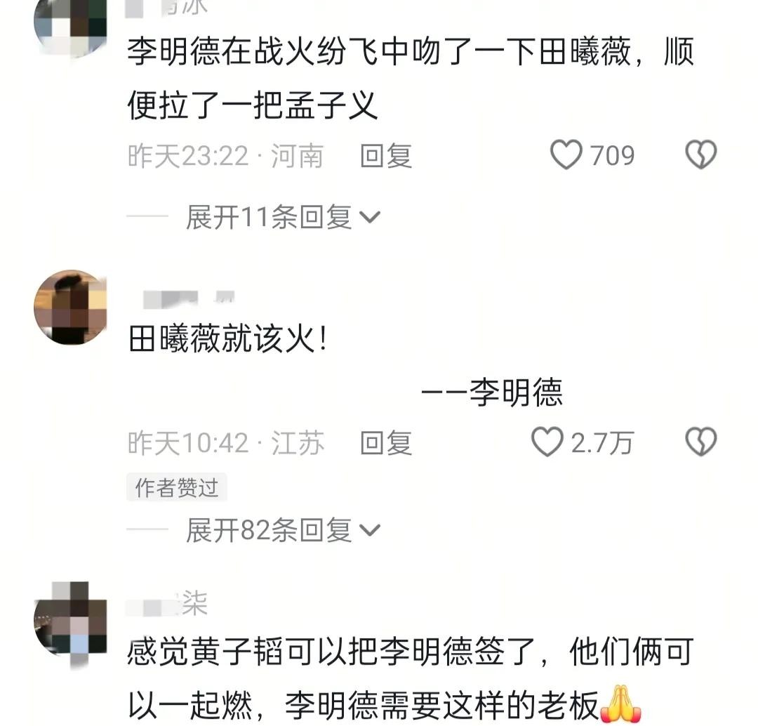 合作过的演员他也没有说不好,有人质疑田曦薇为什么那么火,他直接回复她应该火。