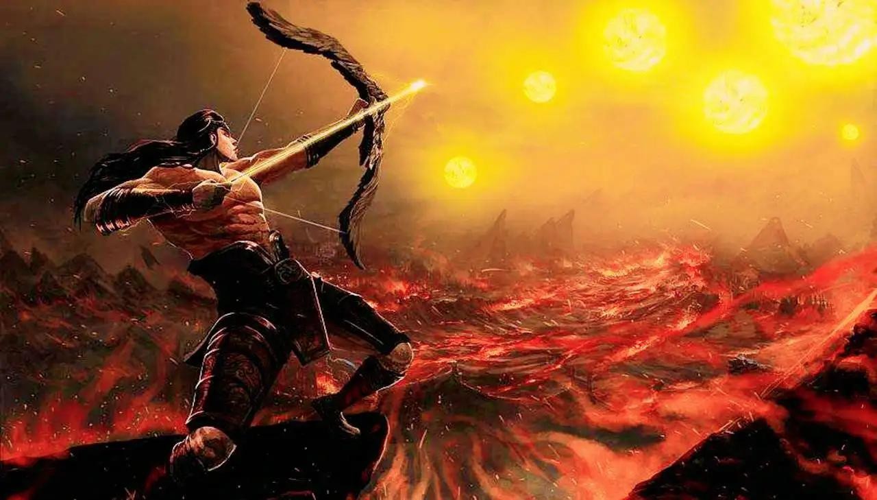 意思是:等到了尧统治的时候,有十个太阳一同出来。灼热的阳光晒焦了庄稼,花草树木枯死,老百姓连吃的东西也没有。猰貐、凿齿、九婴、大风、封豨、修蛇都来祸害人民。于是尧派后羿去为民除害,在南方的泽地荒野杀死凿齿,在北方的凶水杀灭九婴,在东方的大湖青邱用 系着丝绳的箭来射大风,射太阳,接着又杀死猰貐,在洞庭湖砍断修蛇,在中原一带桑林擒获封豨。大羿把那些灾害一一 清除民众都非常欢喜,并推举尧为天子。