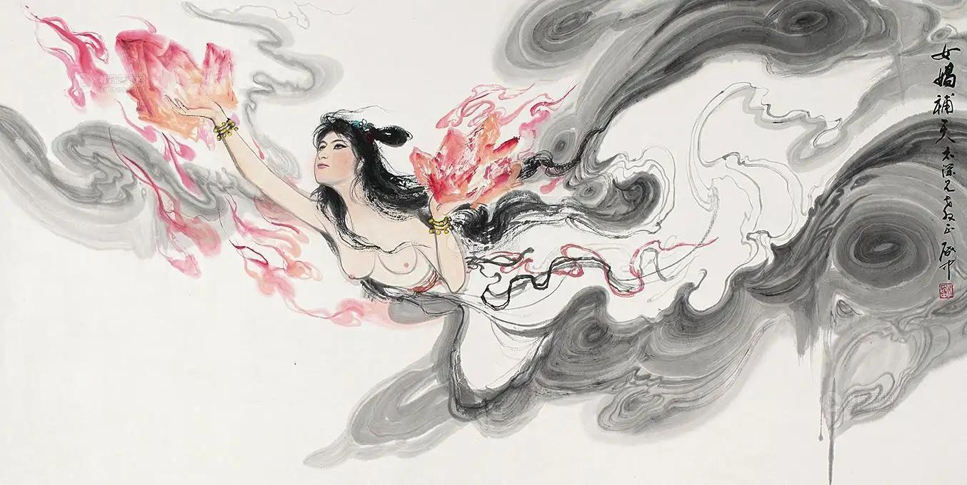 远古时代,四根擎天大柱倾倒,九州大地裂毁,天不能覆盖大地,大地无法承载万物,大火蔓延不熄,洪水泛滥不止,凶猛的野兽吃掉善良的百姓,凶猛的禽鸟用爪子抓取老人和小孩。在这种情况下,女娲冶炼五色石来修补苍天,砍断海中巨鳌的脚来做撑起四方的天柱,杀死黑龙来拯救冀州,用芦灰堆积起来堵塞住了洪水。
