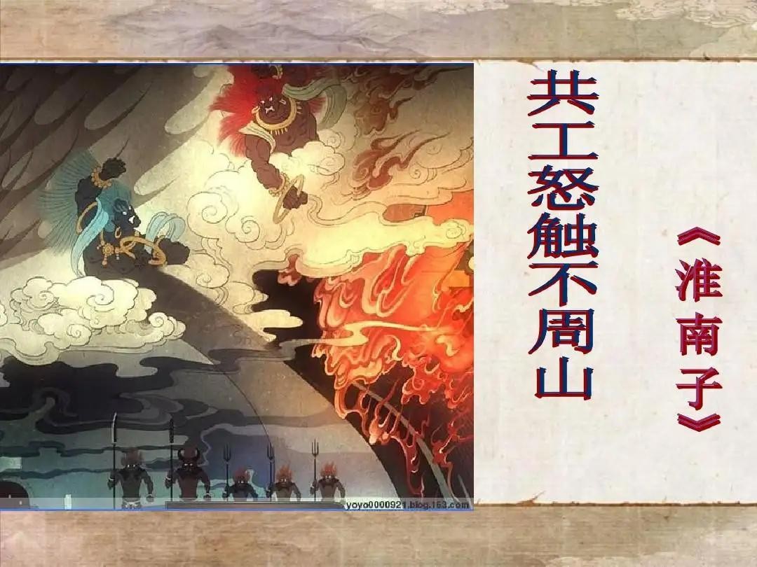 意思是:从前,共工与颛顼争夺为帝,失败了,于是共工发怒(用头)去撞不周山,支撑天的柱子折了,系挂地的绳子断了。天向西北方向倾斜,所以太阳、月亮、星星都朝西北方移动;地面的东南角陷塌了,所以江湖流水都朝东南方向流去。