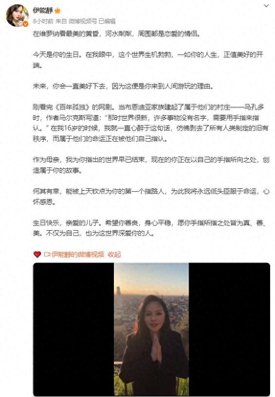“作为母亲,我为你指出的世界早已结束,现在的你正在以自己的手指所向之处,创造属于你的故事。何其有幸,能被上天钦点为你的第一个指路人”,“希望你善良,身心平稳,愿你手指所指之处皆为真、善、美。不仅为自己,也为这世界深爱你的人。”