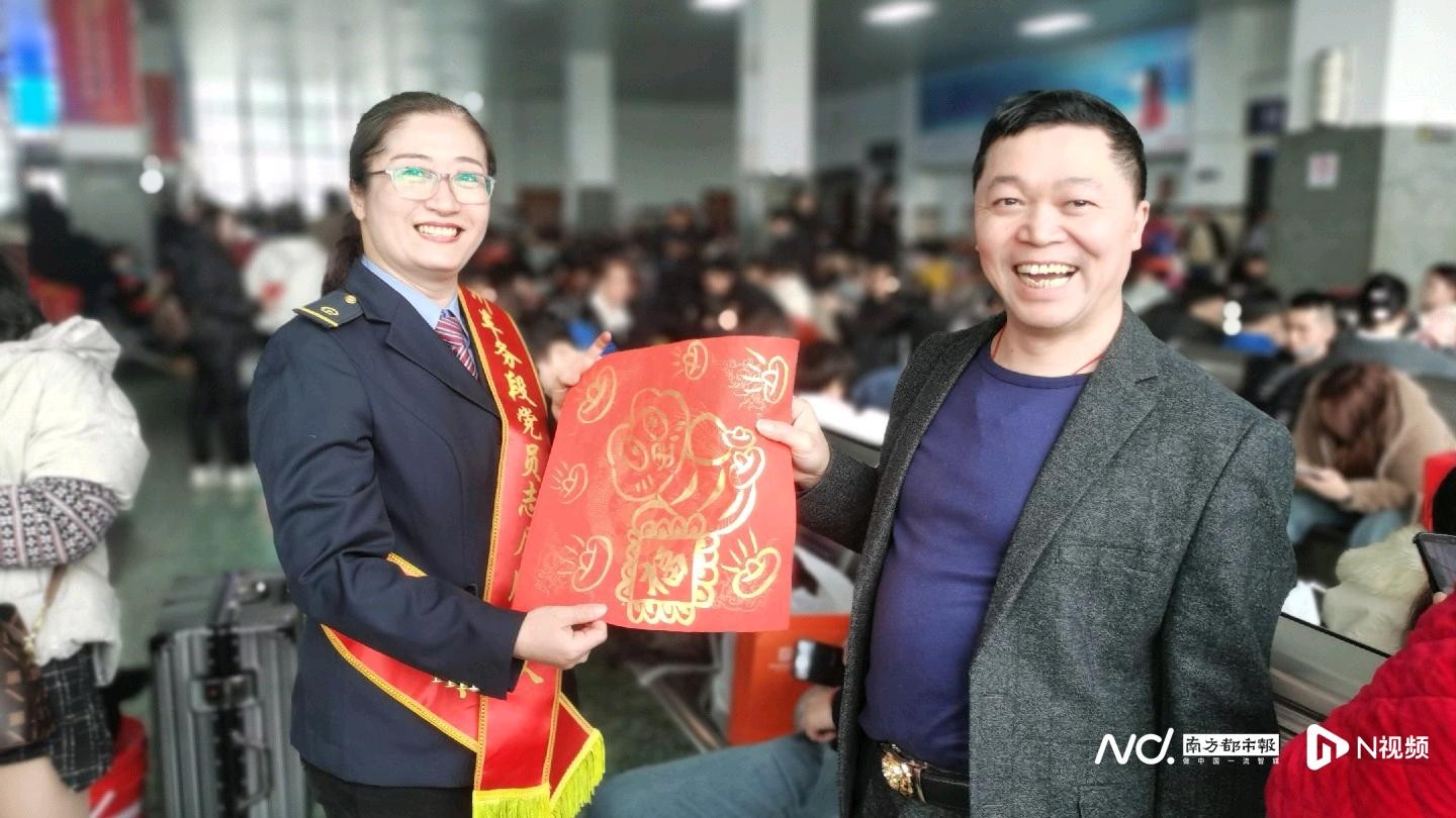 此外,惠州火车站在节前特别策划了一场“送福、送春联”活动。“这春联太有意义了,金蛇送福,感觉新的一年会给我们全家带来好运!”来自湖南的张先生小心翼翼地将春联卷好,准备带回家。