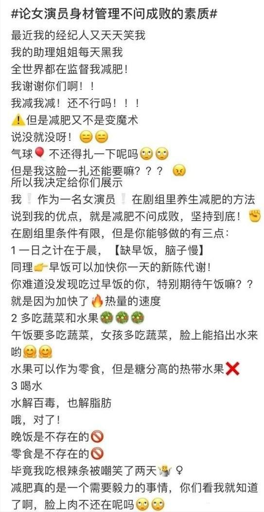 赵露思也大方地跟粉丝们分享了自己的减肥经验。因为一直在剧组里,条件有限,所以只能在饮食上进行调整,饮食要坚持这3点原则:
