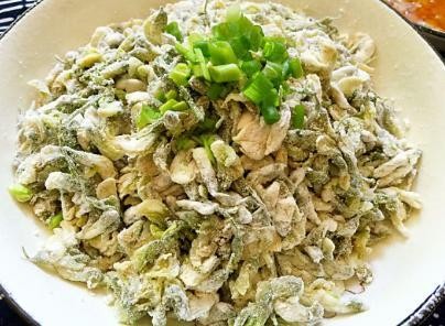 3、拌匀,使菜的外表平均地裹下面粉。待锅中水烧开后散放于蒸屉中蒸制。