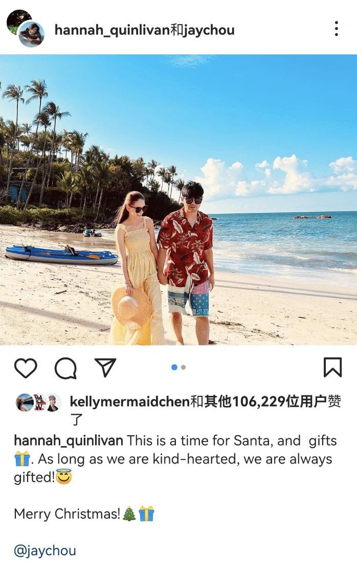 这段时间周杰伦赴新加坡举办演唱会,昆凌作为贤内助也是相随陪伴,顺便一起海外度假。在2022年圣诞节的时候她晒出一组和老公周杰伦在沙滩上的牵手照,画面很是唯美恩爱。照片中,昆凌身穿鹅黄色露肩吊裙,周杰伦牵着爱妻时不时回首望向爱妻,二人走在沙滩上犹如爱情电影里的男女主角,太幸福了吧。