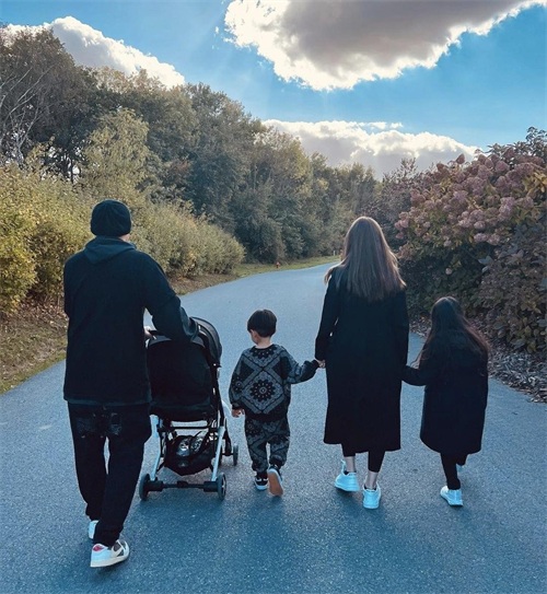 一家人非常默契地都穿着黑色系的衣服,小女儿Jacinda还坐在婴儿车里,周杰伦负责推车,三度成为人父的他早已是个超级奶爸,昆凌则一手牵着大女儿Hathaway,一手牵着儿子Romeo。弟弟的身高已经快要赶上姐姐了。一家五口同框的画面超有爱。