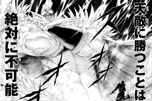 但即使如此,男主(11号勇者)并不愿意就这么逃走,他要为伙伴们报仇。所以他来到了第11个魔王的面前,但是差距真的是太大了。压根就没有看到第11魔王的动作,他就轻松地折断了男主的右臂。男主也是产生了绝对不可能战胜的想法,第11魔王在他的眼中,体型变得巨大并且无法超越。男主利用魔法阵逃走了,并且还包扎好了伤口。