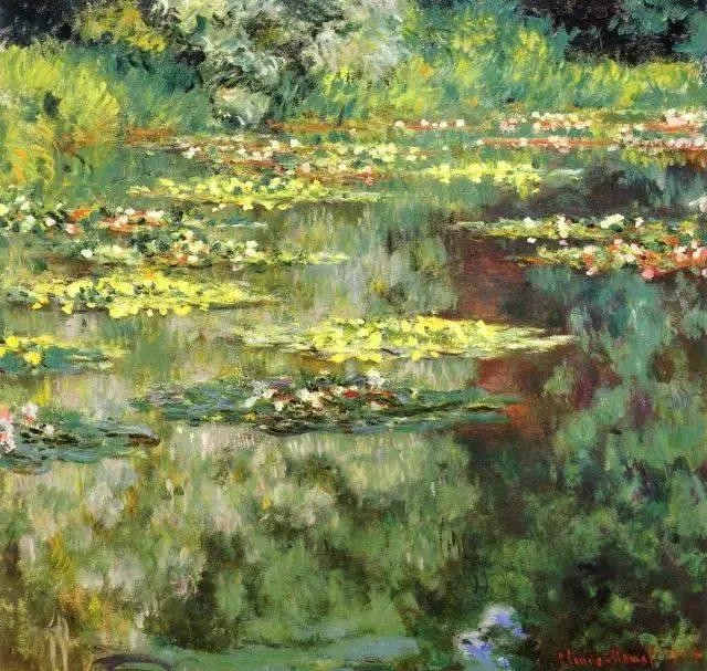 蓝睡莲,就是艺术的花,尼罗河畔的垂柳,倒映在深蓝色的河水里,天光云影融化出清格幽幽的睡莲,花瓣沾染上了淡淡的蓝色,仿佛眼眸里的蓝色精灵;这深深浅浅的蓝色池塘,便是一种扑朔迷离的“蓝色意境”,便是一方安静清微的“蓝色世界”,便是一个神秘幽深的梦幻世界,也便有了莫奈的《蓝睡莲》,深蓝的水面浮起的浅淡的蓝睡莲,仿佛是绿睡莲沾染了那一片深浓鲜亮的“紫蓝”,才变成了一群“蓝绿精灵”,清灵、优雅、宁静又有一点点缥缈,清柔的睡莲、柳树、湖水宁静祥和却梦幻诗意,是斑驳中的精致,平静中的激越,精致到极致,激越却节制,就是幽微清淡和神奇精致的契合,就是光线与色彩组合的神奇迷宫,无限深刻也不可捉摸,每个人都有别样的理解和把握。