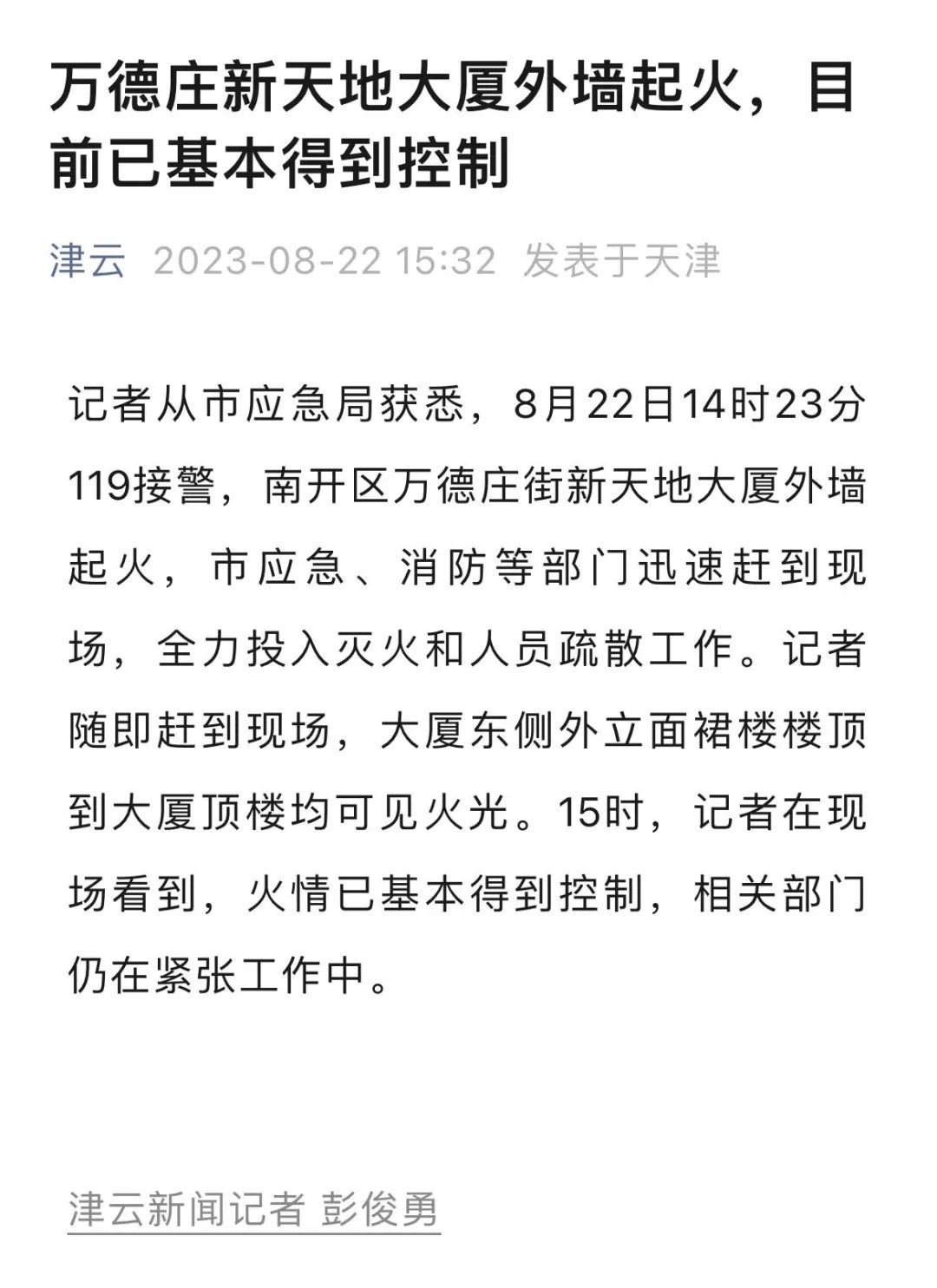 另据天津市应急局消息,8月22日14时23分119接警,南开区万德庄街新天地大厦外墙起火,市应急、消防等部门迅速赶到现场,全力投入灭火和人员疏散工作。记者随即赶到现场,大厦东侧外立面裙楼楼顶到大厦顶楼均可见火光。15时,记者在现场看到,火情已基本得到控制,相关部门仍在紧张工作中。