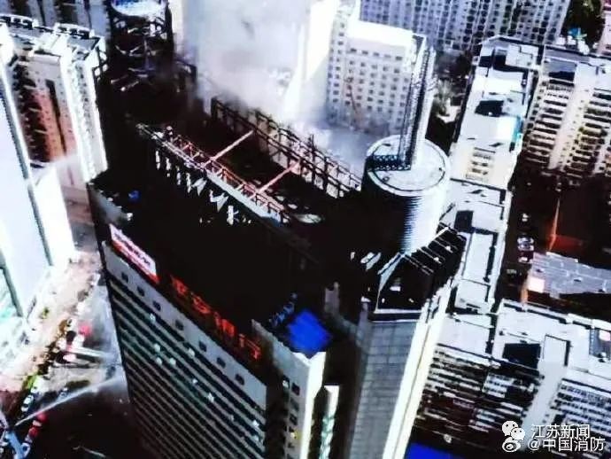 15时50分,天津消防救援人员在新天地大厦楼顶扑救火灾,明火已基本扑灭,正在清理残火。