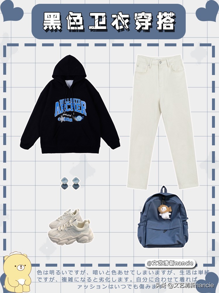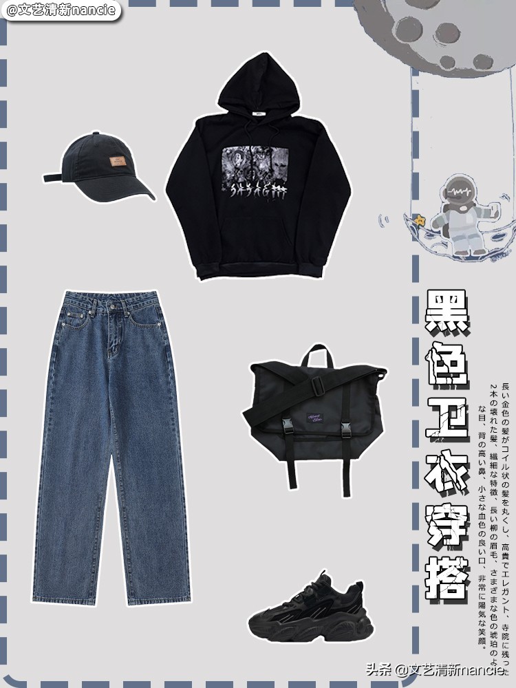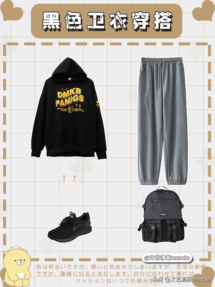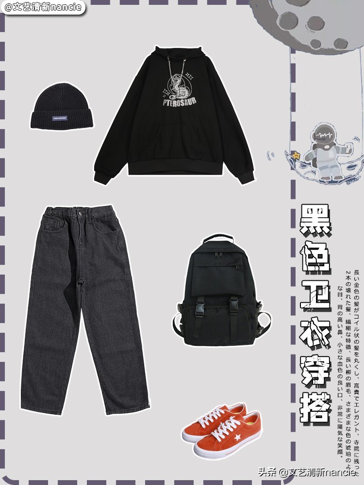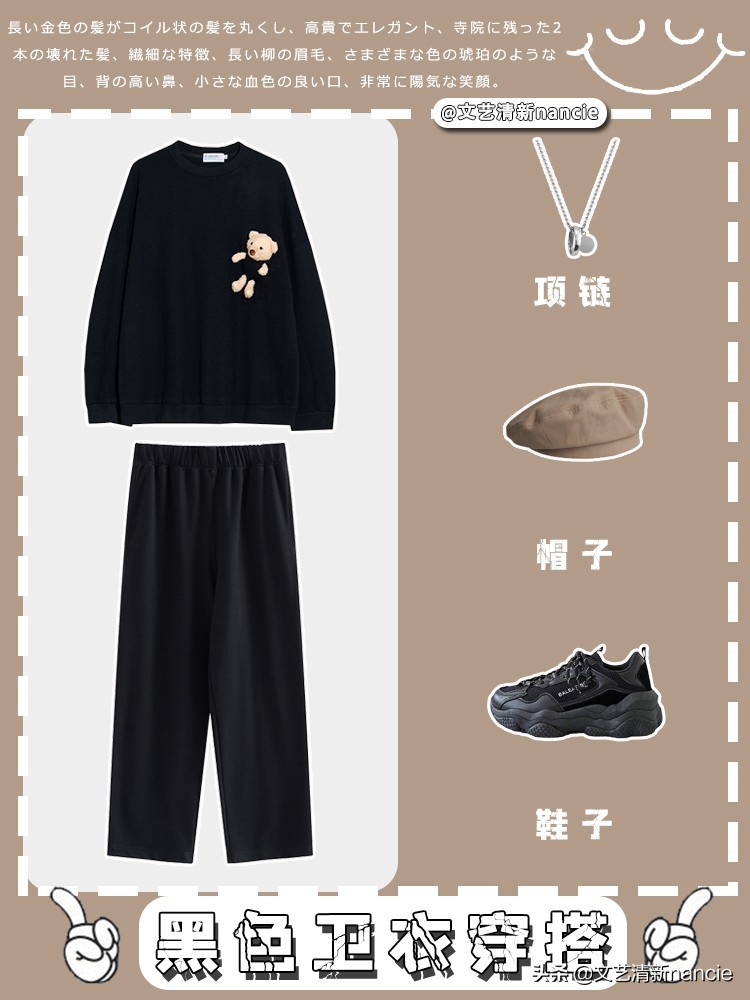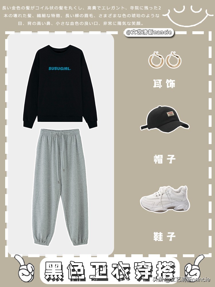 连帽的黑色卫衣,搭配运动休闲裤,可谓永远不会出错的搭配,鞋子方面可以按照自己的喜爱,我挑的是黑色的厚底鞋,配上双肩包包,上课或旅游都可以呢。