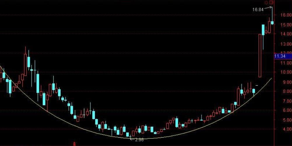这类的底部,最近几年感觉明显增多。在底部形成一个圆弧的形态,且成交量也呈现出圆弧形态,而一旦出现成交量逐步放大,且突破颈线位,是一个比较好的介入时机。