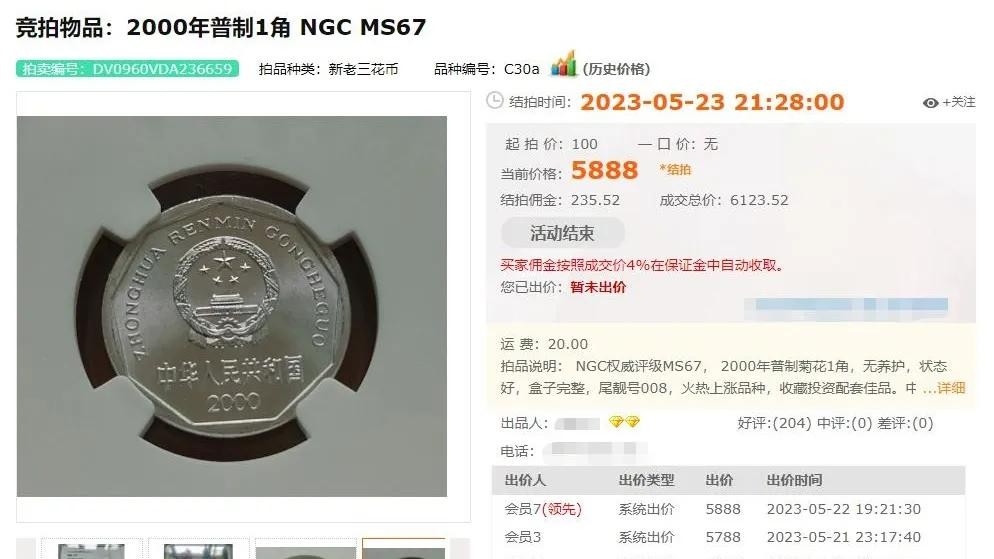 和MS评级69分的,在去年5月拍出了每枚5888元的高价。还有几枚普制币和精制币都拍出了4000元到5000元的高价。为什么它们能拍出这么高的价呢?这是因为2000年菊花1角,没有公开发行,没有上市流通,只在千禧之年制造了2万枚精制币,30万枚普制币,和其它硬币装帧在年度《中国硬币》的套装中,作为收藏品或赠品出售或赠与外国友人。这种硬币品相全新、极佳、完美,数量稀有,故价值就高。