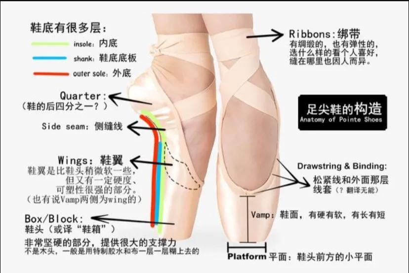 PLATFORM(平面):在鞋头最前端。演员依靠这个平面站立在脚尖上。