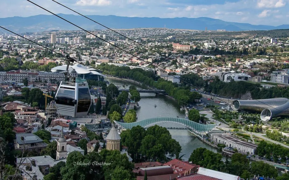 第比利斯市中心横亘着的库拉河,源头来自土耳其的东北部,然后流入格鲁吉亚,并且贯穿第比利斯,再流向阿塞拜疆直到里海。建在库拉河上的和平桥 (Peace Bridge),是一条连结着旧城与新城区的行人桥,长150米,上盖由钢管与玻璃构造而成,造型如同一条巨大的海洋生物,象征人类的生命与和平。远处山丘上的便是高加索最大的东正教堂 “圣三一教堂 (Tsminda Sameba Cathedral)" …