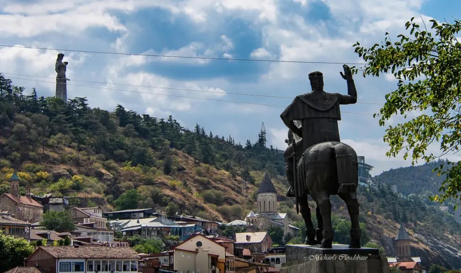 传说是第比利斯的建城者 – 伊比利亚国王瓦赫坦格一世 (Vakhtang I Gorgasali) 的铜像与城市守护神 – 格鲁吉亚之母遥遥相对,共同守护着他们的国土…