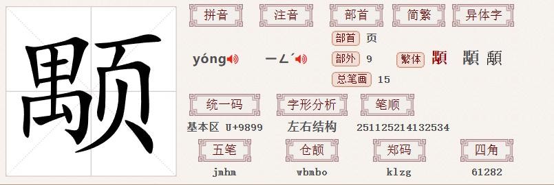 首先,我们来了解一下颙琰中的“颙”字,这个字读作【yóng】,部首为页,左右结构,共十五笔,笔顺为251125214132534