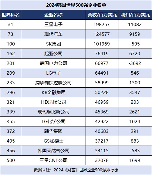 2024韩国世界500强企业名单:3家位列世界百强,3家利润为负