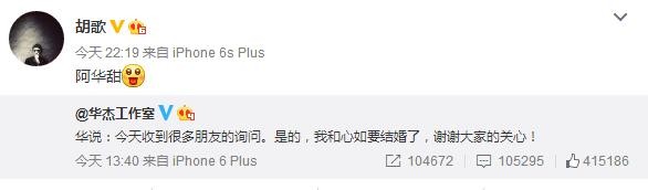 胡歌深夜发文祝福霍建华“阿华甜”。