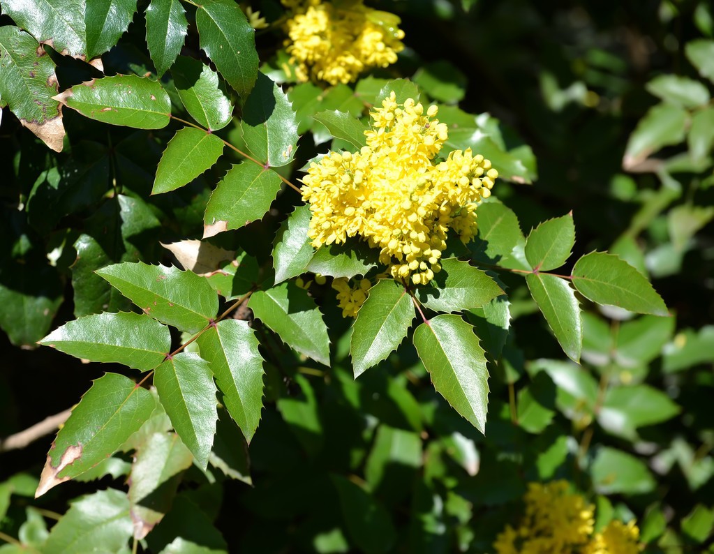 阔叶十大功劳四季常绿,树形雅致,开黄色花,栽在房前屋后、池边、山石旁,青翠典雅。作为切花更为独特。