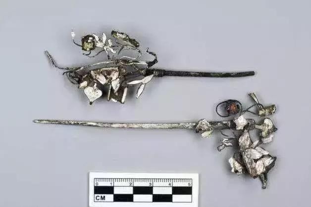 在此次出土的文物中,不乏精美的饰物。比如精致小巧的银鎏金龙纹耳环,直径不足1.5厘米,却雕刻着活灵活现的龙头,口尾相衔,略带霸气;颤巍巍的鎏金银花簪,簪头摇曳着银莲花、银荷叶、银桃心,还镶嵌一颗彩色宝石拟做莲蓬。