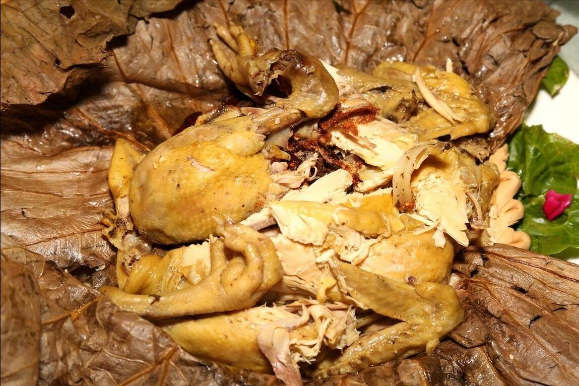 做法独特,将鸡用荷叶和泥土包裹烤制,增添了独特的香气。