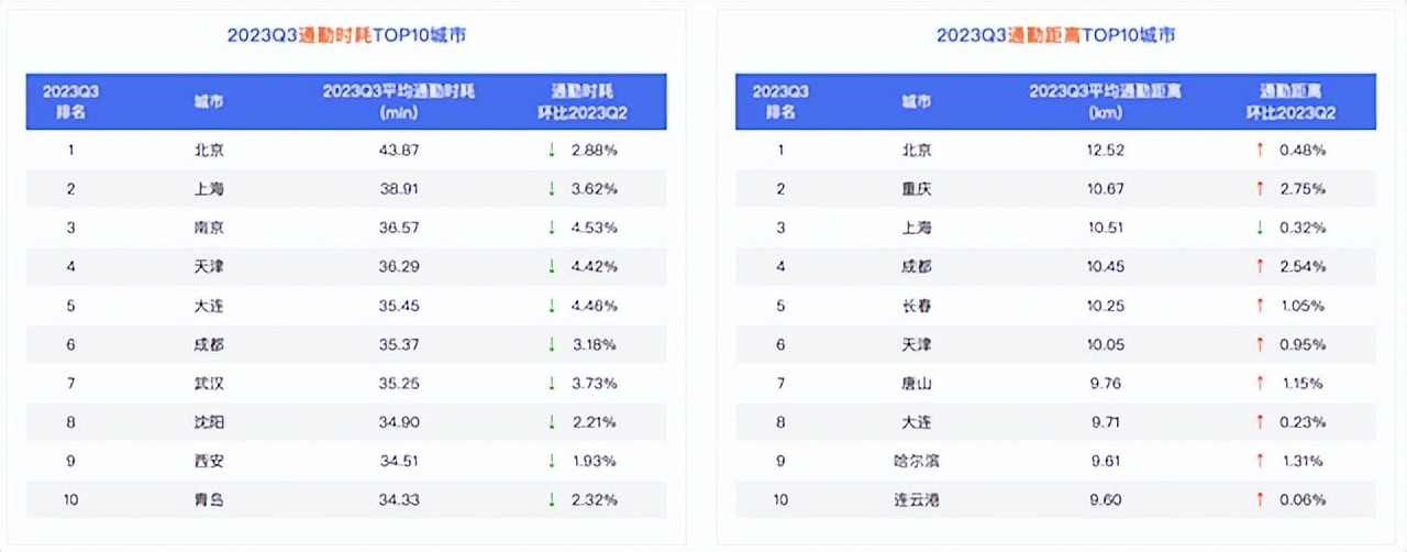 上海、南京、天津等地紧随其后,时耗也在30分钟以上。在通勤距离方面,北京、重庆、上海位居前三,平均通勤距离均超过10公里。