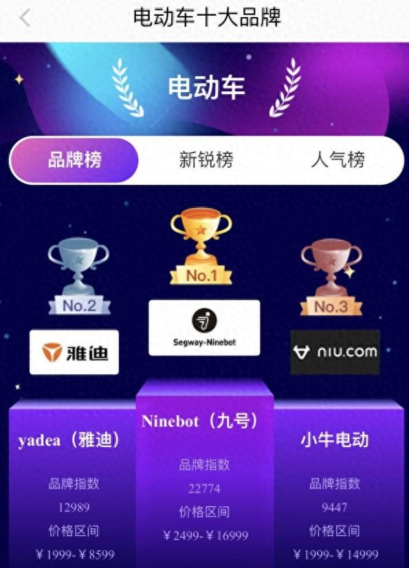 在最新一期的十大品牌排行榜中,九号电动车是最新的品牌,虽然只有短短几年的时间,该品牌的发展速度却非常快,经常出现在电动车品牌排行榜的第1名。