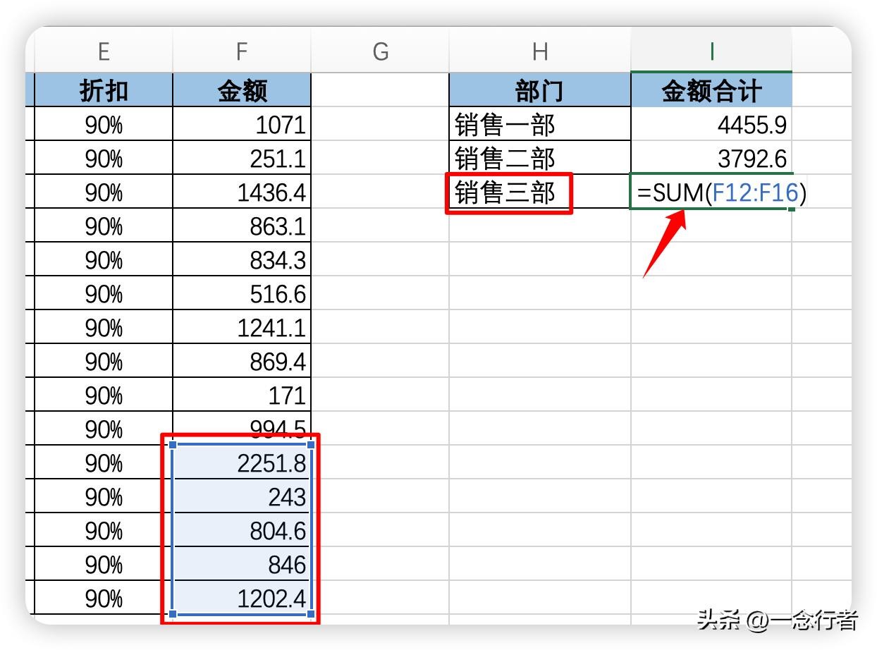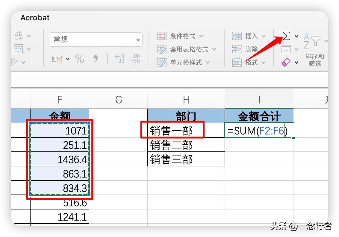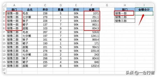 我们来按部门进行金额的汇总,求合计金额自然就想到了求和函数SUM。
