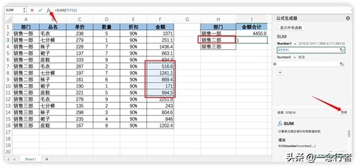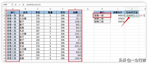 如果A列中单元格等于H2(销售一部),那么对F列中满足条件的数据求和。