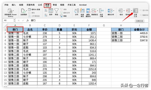 Excel中还提供了一个“可视化”的「分类汇总」功能,选中表中任意一个单元格,点击「数据」选项卡下的「分类汇总」图标。