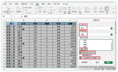 表格连续区域的数据都被选中,同时弹出分类汇总的窗口,设置分类字段为部门,汇总方式为求和,选定汇总项为金额。替换当前分类汇总和汇总结果显示在数据下方这两项都打上对勾。