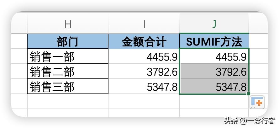 条件求和的好处是方便对公式进行“复用”,选中J2单元格,按住J2单元格右下角的黑十字填充柄下拉,J2单元格的公式会相对引用H列各部门的名称进行条件求和。