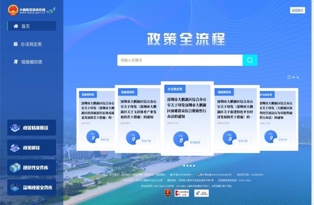 大鹏新区政府在线网站以办法规定、措施细则为分类,从政策制定或修改的源头开始,贯穿意见征集、反馈、专家论证、听证、风险评估、发布、解读、问答、申报、公示、效益评估等全生命周期,将以往各部门政策不集中、环节不清晰的单一化、碎片化的制定流程,转变为贯穿政策全生命周期的标准化、集成化、规范化精准服务,为企业、群众搭建起一个覆盖全面、动态更新的政策平台。