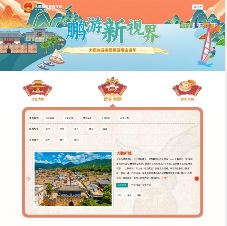 大鹏新区政府在线网站创新推出“吃住玩”版块,汇聚大鹏的美食、住宿、景点以及文化活动等资讯,打造服务游客的一站式旅游指南,及时提供全面、精准、便捷的各类旅游资讯服务。同时,精心推出“甜蜜浪漫之旅”“绿色自然之旅”“红色寻迹之旅”等若干条精品游玩线路,方便游客根据旅游标签选择合适线路。