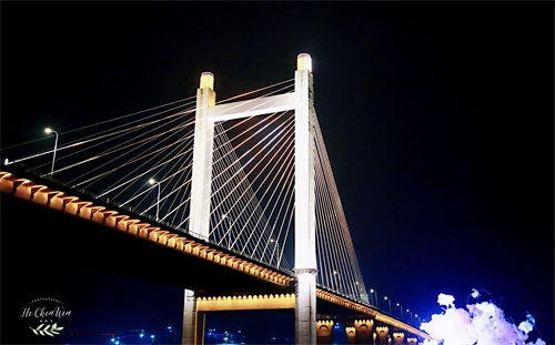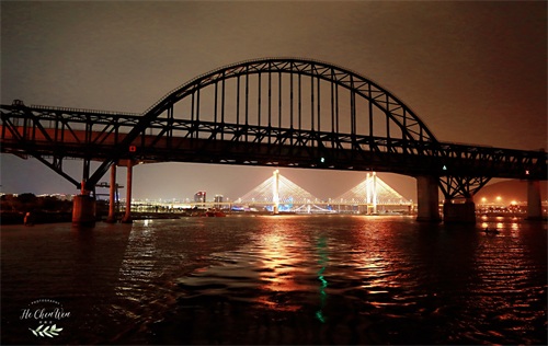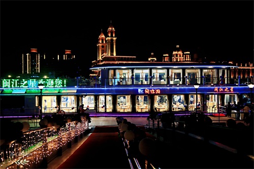 晚上风比较大,特别是秋冬季节,一定要记得多穿衣服,不然很容易着凉。游船停靠在台江码头,这里可以看到横亘于江面的解放大桥,灯光把它变成一条彩带,中洲岛上的欧式建筑,在灯光下也愈发迷人。