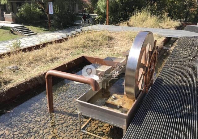 生态园内随处可见一些非常有创意的水文化游乐设施,一位小朋友对这个取水设备非常感兴趣,通过摇杆转动就可以将池中的水取出来,非常有意思。