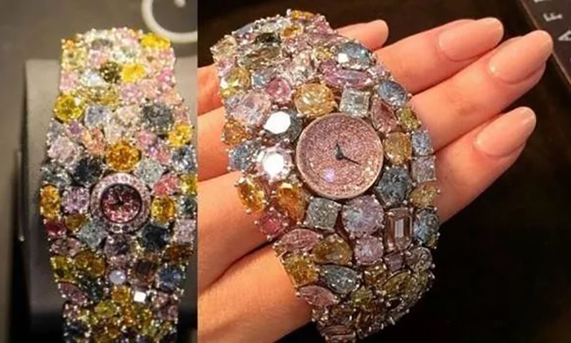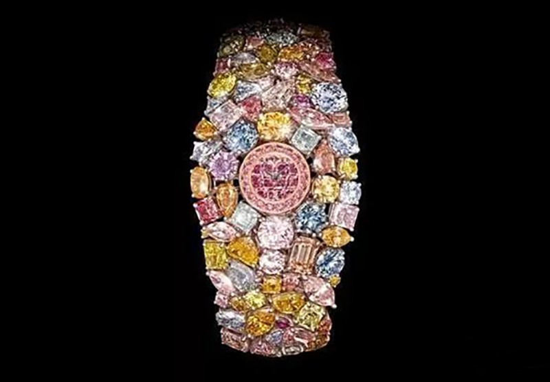 这款手表由201克拉钻石组合,共874颗钻石,包括粉钻、白钻、蓝钻、小黄钻。手表装置很特别,要打开3颗心形钻石才可以看到时间。