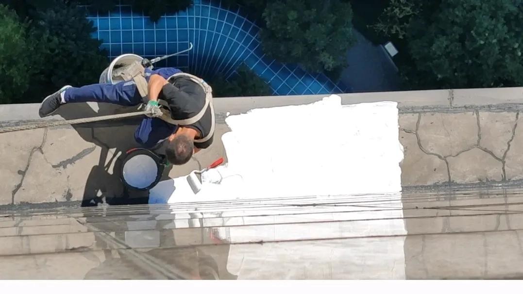 4、吊绳蜘蛛人对外墙裂缝进行封堵,对窗户以上墙体涂刷防水材料,做到精准堵漏大面积防控的双重保障。