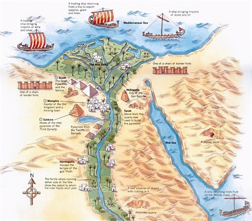 这些早期国家在经过长期的兼并战争后逐渐形成北部的下埃及王国和南部的上埃及王国。下埃及王国的国王头戴红色王冠,以眼镜蛇为图腾、蜜蜂为国徽;上埃及王国的国王头戴白色王冠,以神鹰荷鲁斯为图腾、白色百合花为国徽。大约5100年前上埃及国王美尼斯征服了下埃及王国,开创了世界上最早的统一王朝。尼罗河是埃及赖以生存的母亲河——正是尼罗河的定期泛滥使古埃及人得以发展定居农业,然而这条古埃及文明的母亲河、世界第一长河的水量却相当有限。